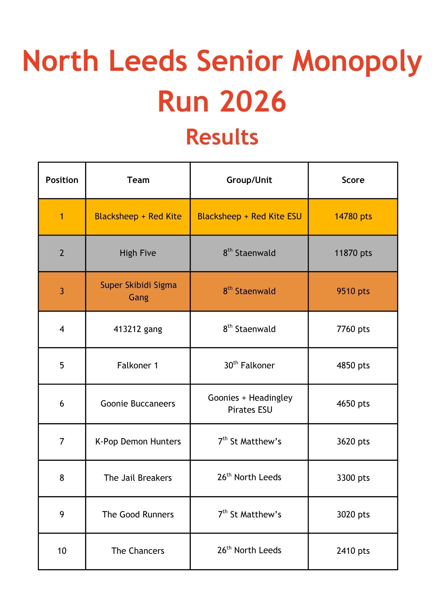 A huge congratulations to every single team no matter where you placed, for the amount of effort you put in, as you can see, some of the results were incredibly close. An even bigger congratulations to Blacksheep + Red Kite and 7th Cubs, who were our overall winners for the Senior and Junior event